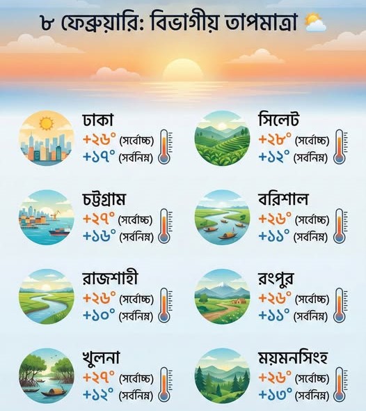 দেশের ৮ টি বিভাগীয় শহরের সম্ভাব্য তাপমাত্রা: