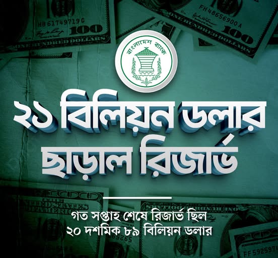 দেশের বৈদেশিক মুদ্রার রিজার্ভ আবার ২১ বিলিয়ন ডলার অতিক্রম করেছে, যা এখন ২১.১১ বিলিয়ন ডলার। রেমিট্যান্স ও রফতানি আয় বেড়ে যাওয়ায় এবং ডলারের দর স্থিতিশীল...